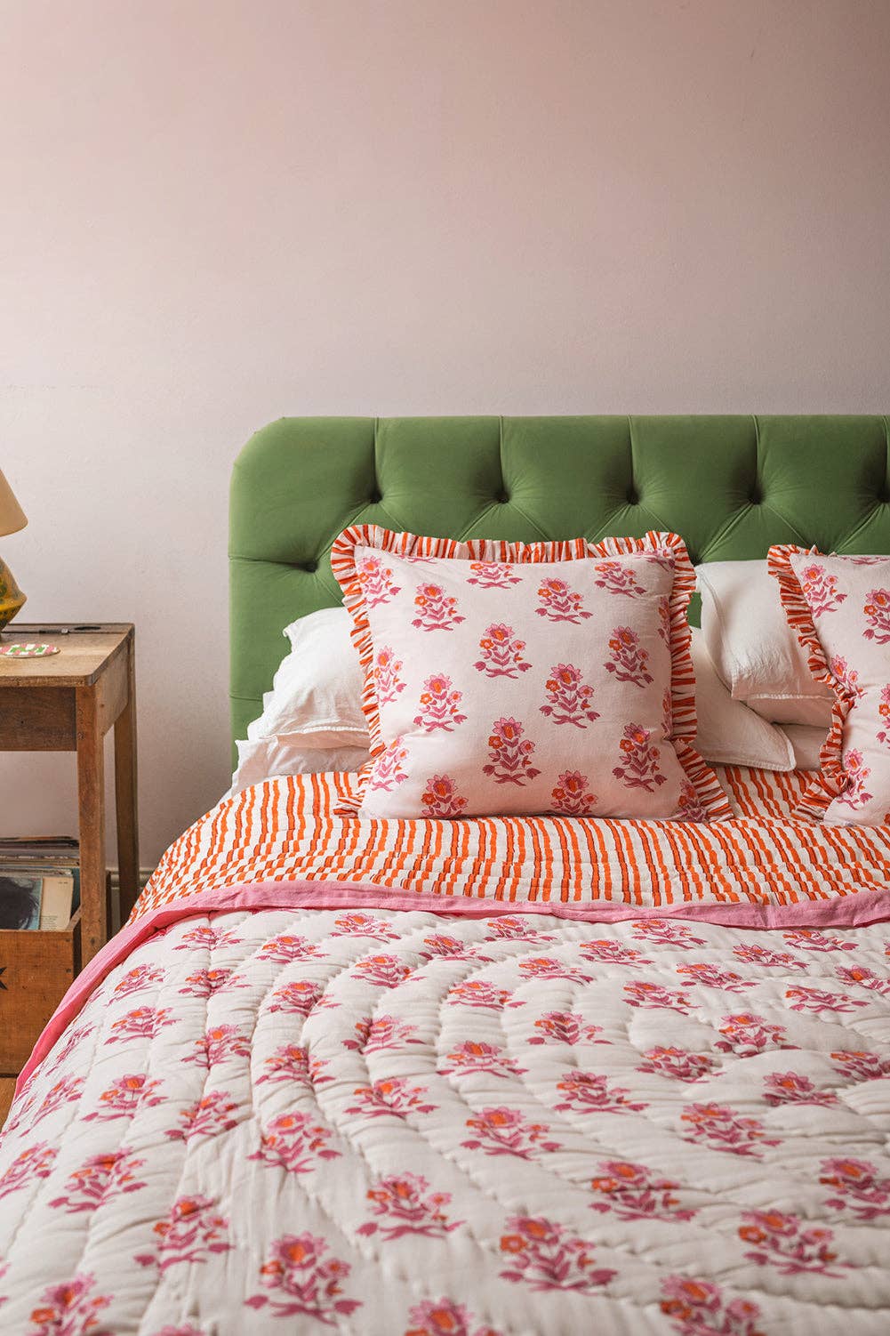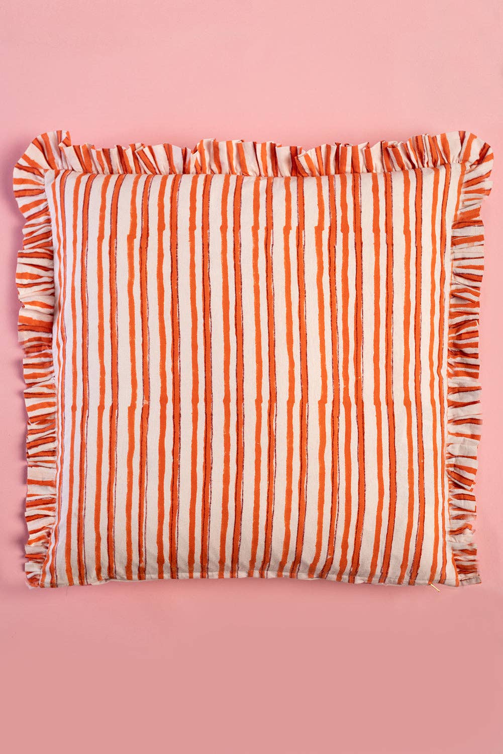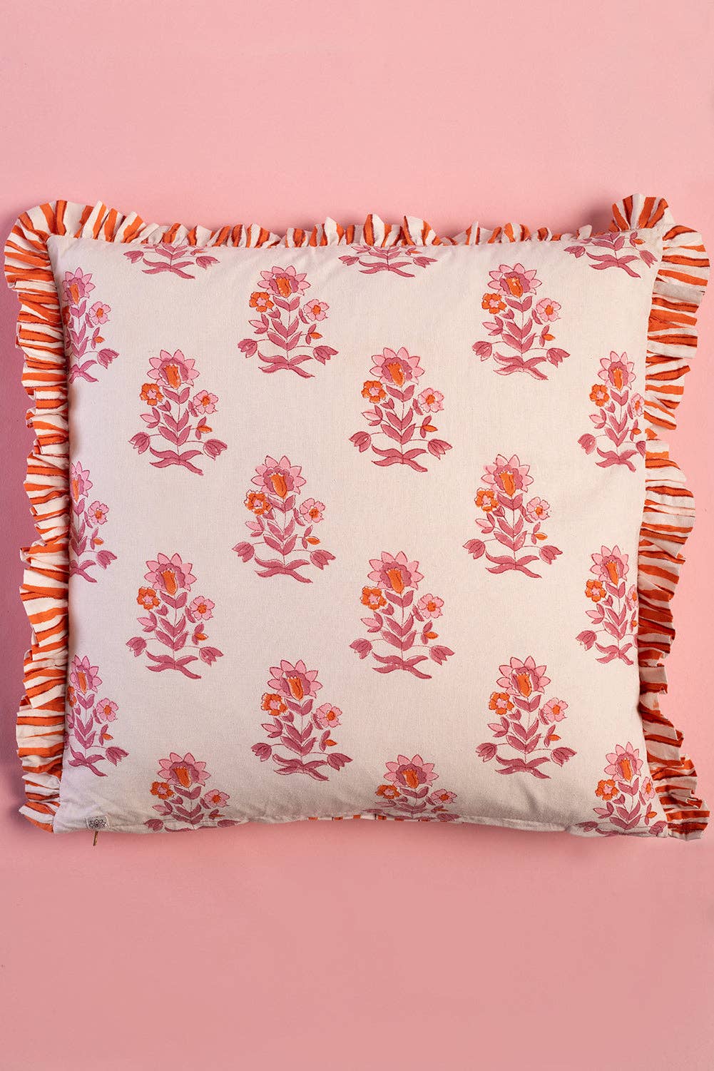 A little joy for your sofa. This reversible cotton cushion is hand block printed in Jaipur, with elegant florals on one side and cheerful stripes on the other. Carnation pink and zesty clementine orange bring the colour, finished with a luxe striped frill edge. Complete with a feather inner for sink-in comfort.
