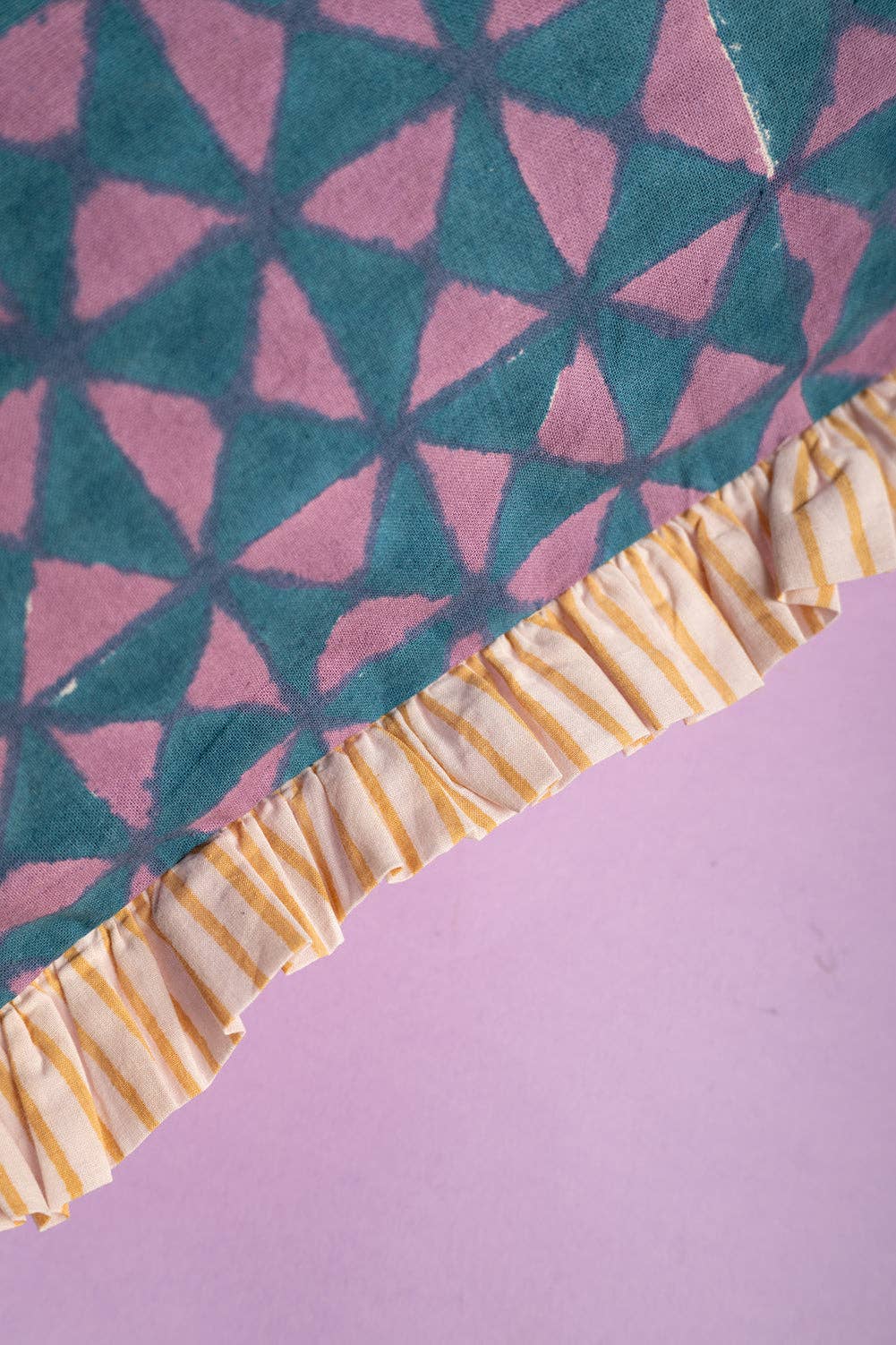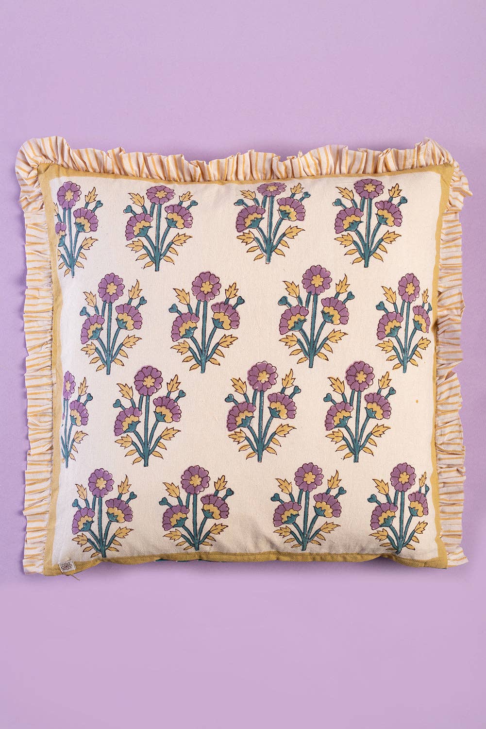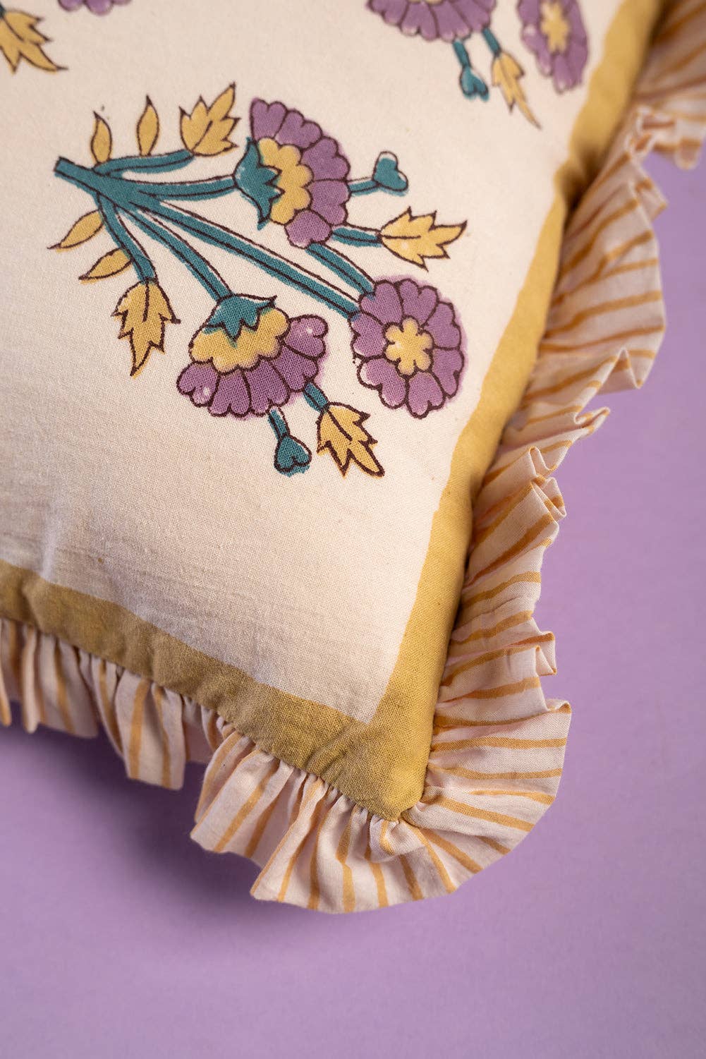 Big on comfort, bold on colour. This large cotton cushion is hand block printed in Jaipur, with classic florals on one side and a playful geometric pattern on the other. Cornflower blue and soft lilac are lifted with pops of mustard yellow, finished with a luxe striped frill edge and a feather-filled feel thanks to the inner. Perfect for sinking into.