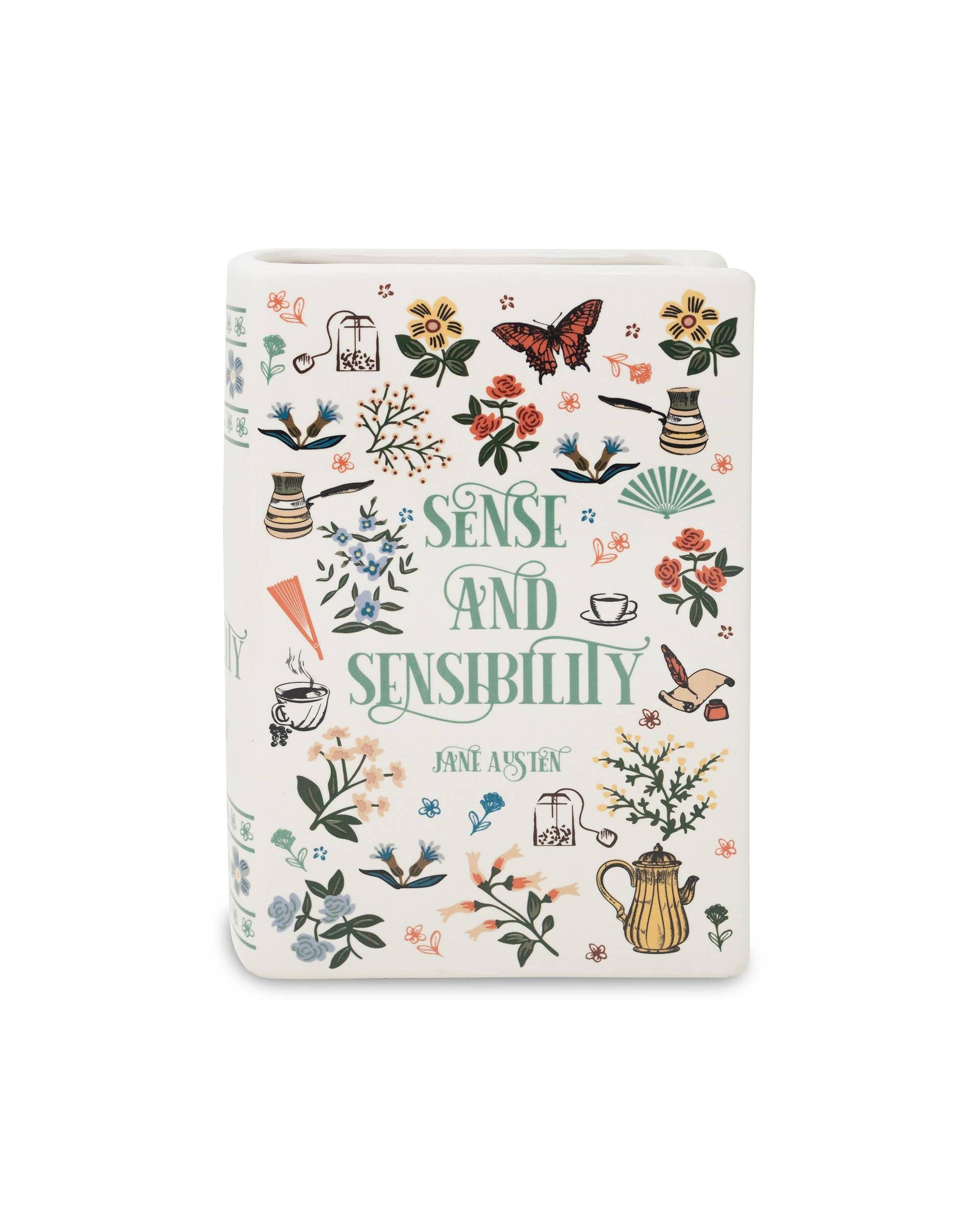 Our large ceramic book vase is the perfect piece for any book lover's space. Designed to mimic a hardcover book, the vase features sculpted pages, with a wide top opening for flowers, desk supplies, utensils, and more. The cover features art inspired by Jane Austen's beloved novel, Sense and Sensibility to adorn your space with bookish charm.