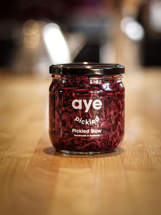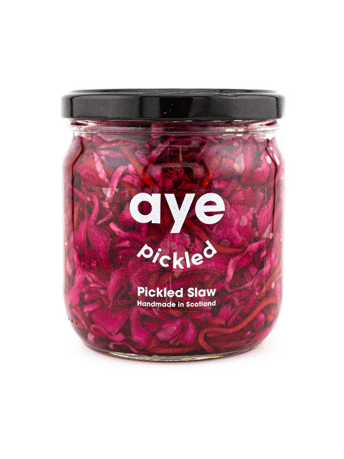 Spice up your meals with Aye Pickled's Pickled Slaw, made with pickled red cabbage. This colorful slaw is a perfect blend of sweetness and crunch. Enjoy it with cheese, BBQ meat, or on a loaded baked potato.