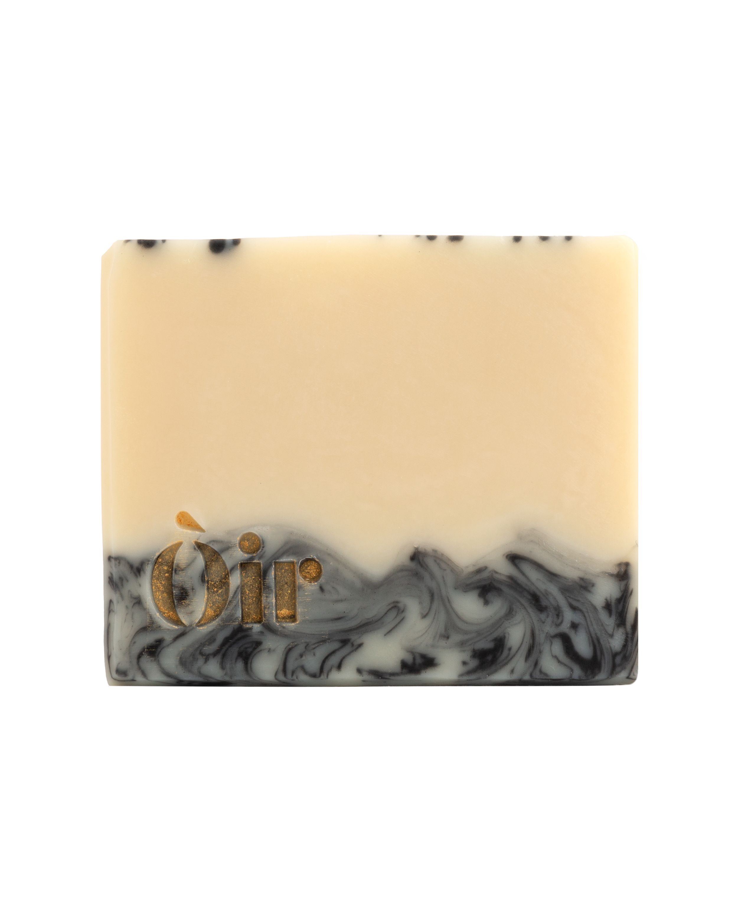 Ingredients: sodium olivate (olive oil), sodium cocoate (coconut oil), sodium shea butterate (shea butter), sodium castorate (castor oil), sodium cocoa butterate (cocoa butter), aqua (water), glycerine, rosmarinus officinalis leaf oil (rosemary essential oil), cinnamomum camphora linalooliferum wood oil (ho leaf essential oil), pelargonium graveolens flower oil (geranium essential oil), charcoal powder, kaolin, gold mica (CI 77019, 77891, 77491)