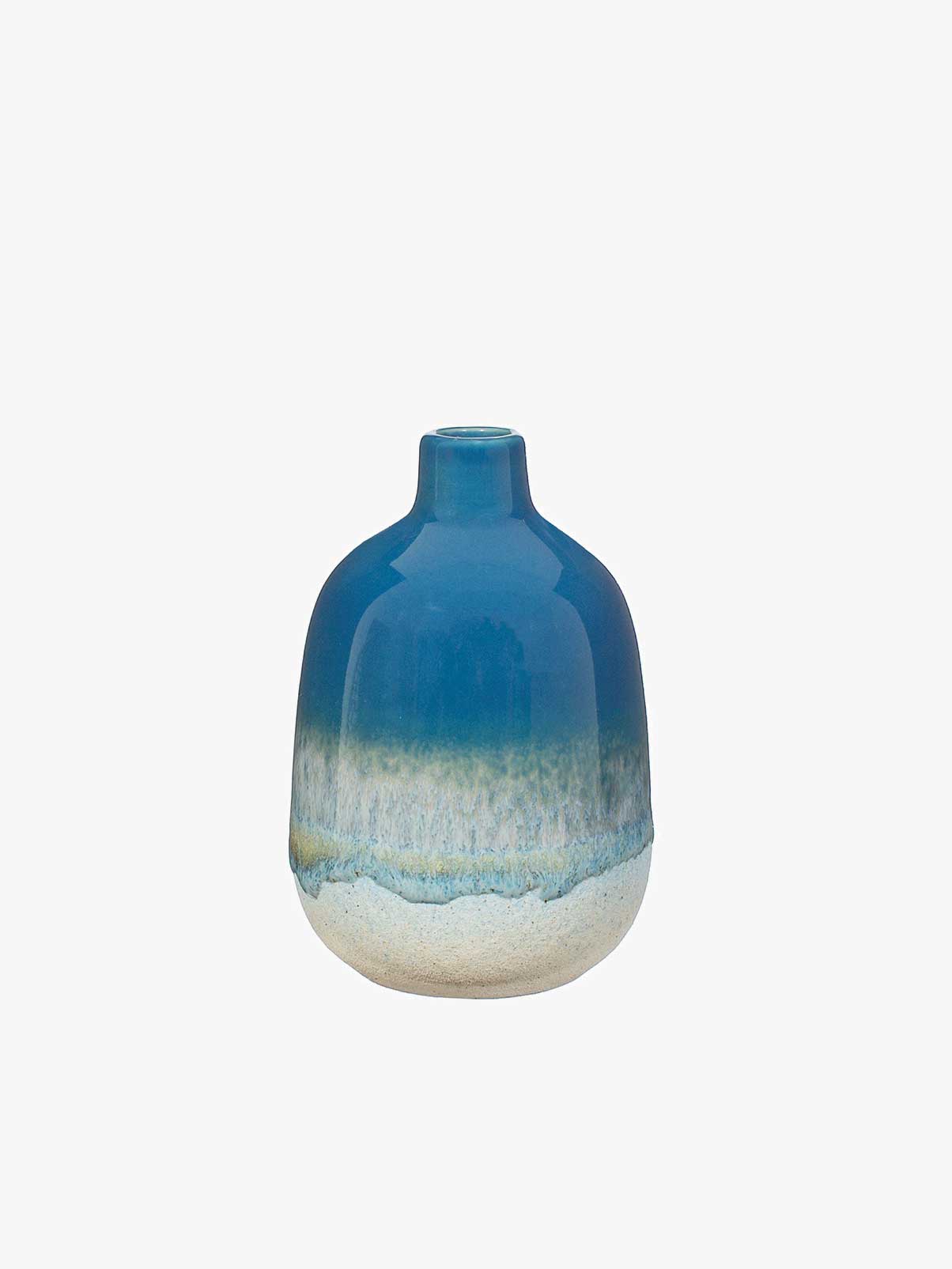 Here we have the Mojave Glaze Blue Vase from Captivate. This Mojave glaze vase is finished with an ocean blue tone. The rustic texture and dip ombre effect are created from the reactive glaze which forms subtle variations in colour tones, making each one beautifully unique. Completed with a gloss finish.