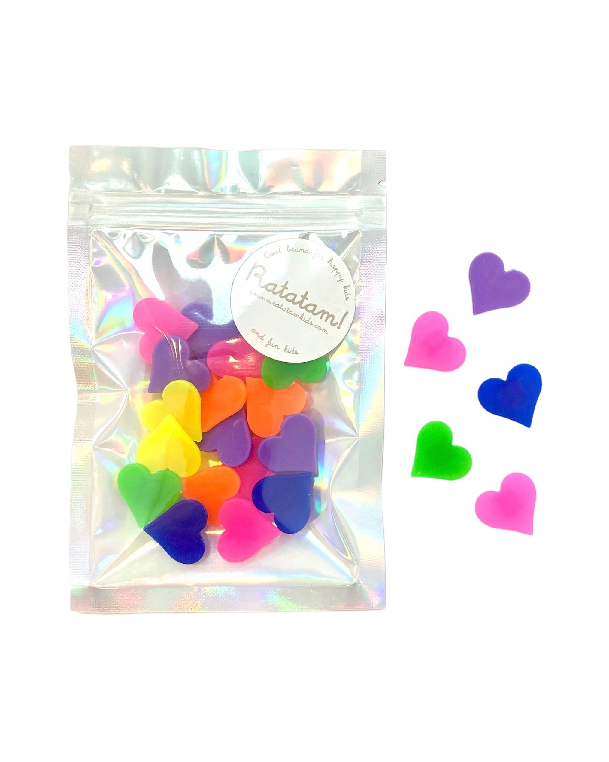 1 bag of 20 small multicoloured hearts to hang on the bike spokes.