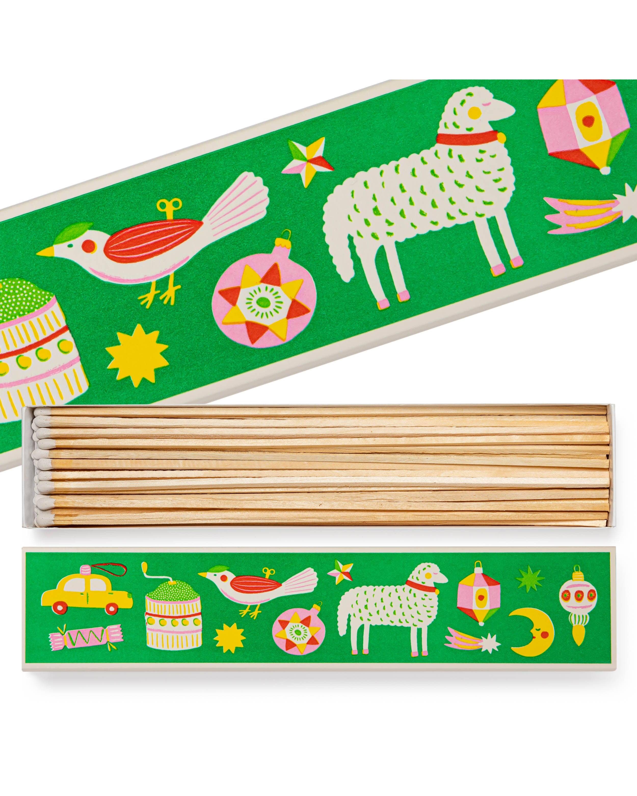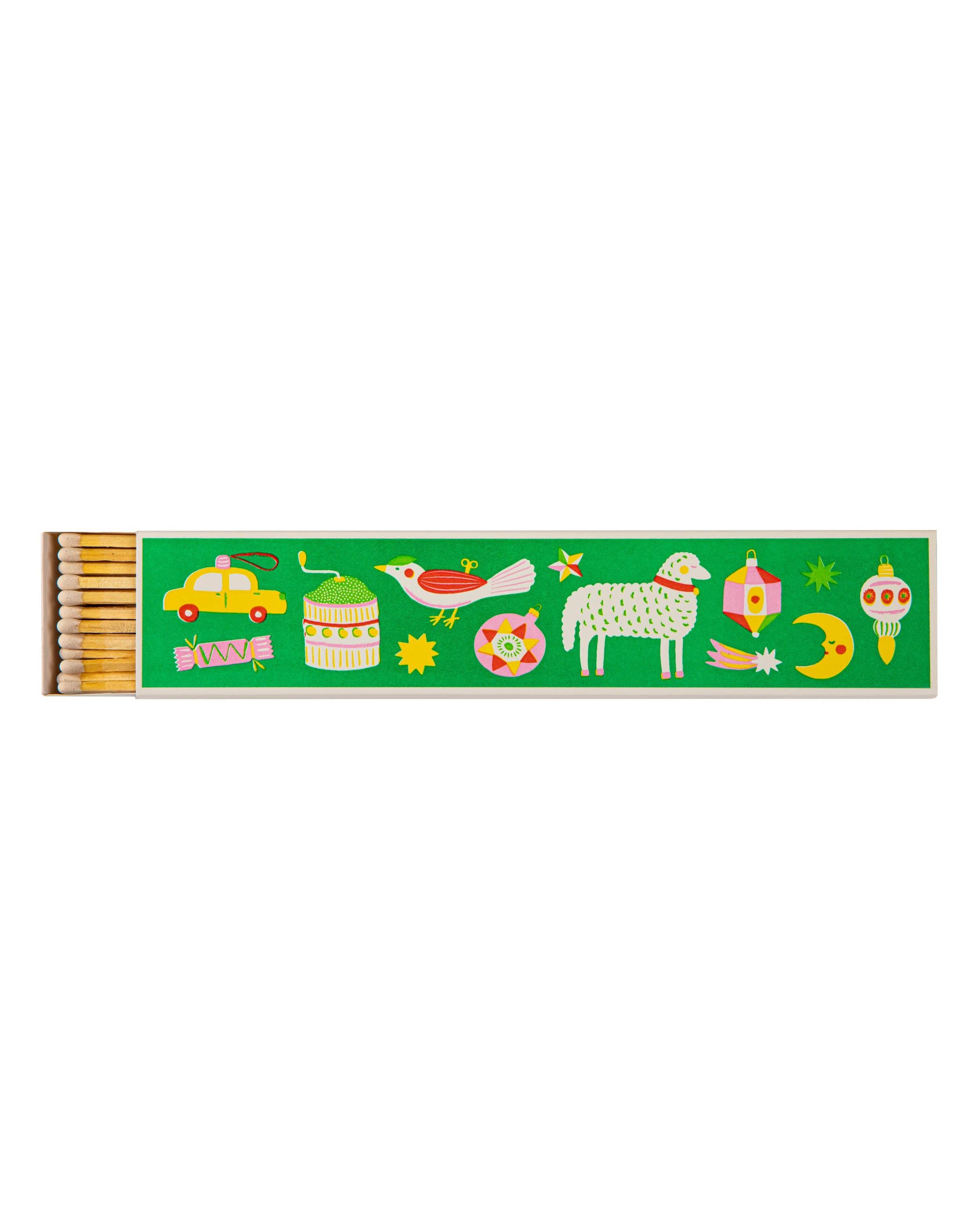 Our long matchbox featuring an array of Christmas orniments in various bright colours on a bold green background.