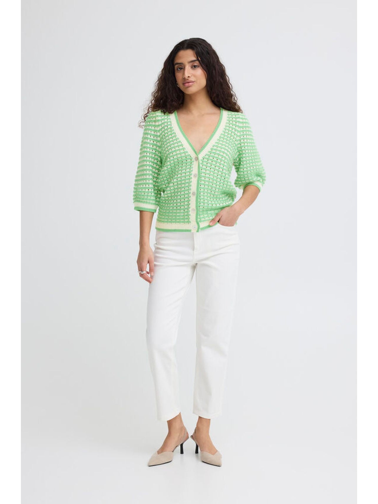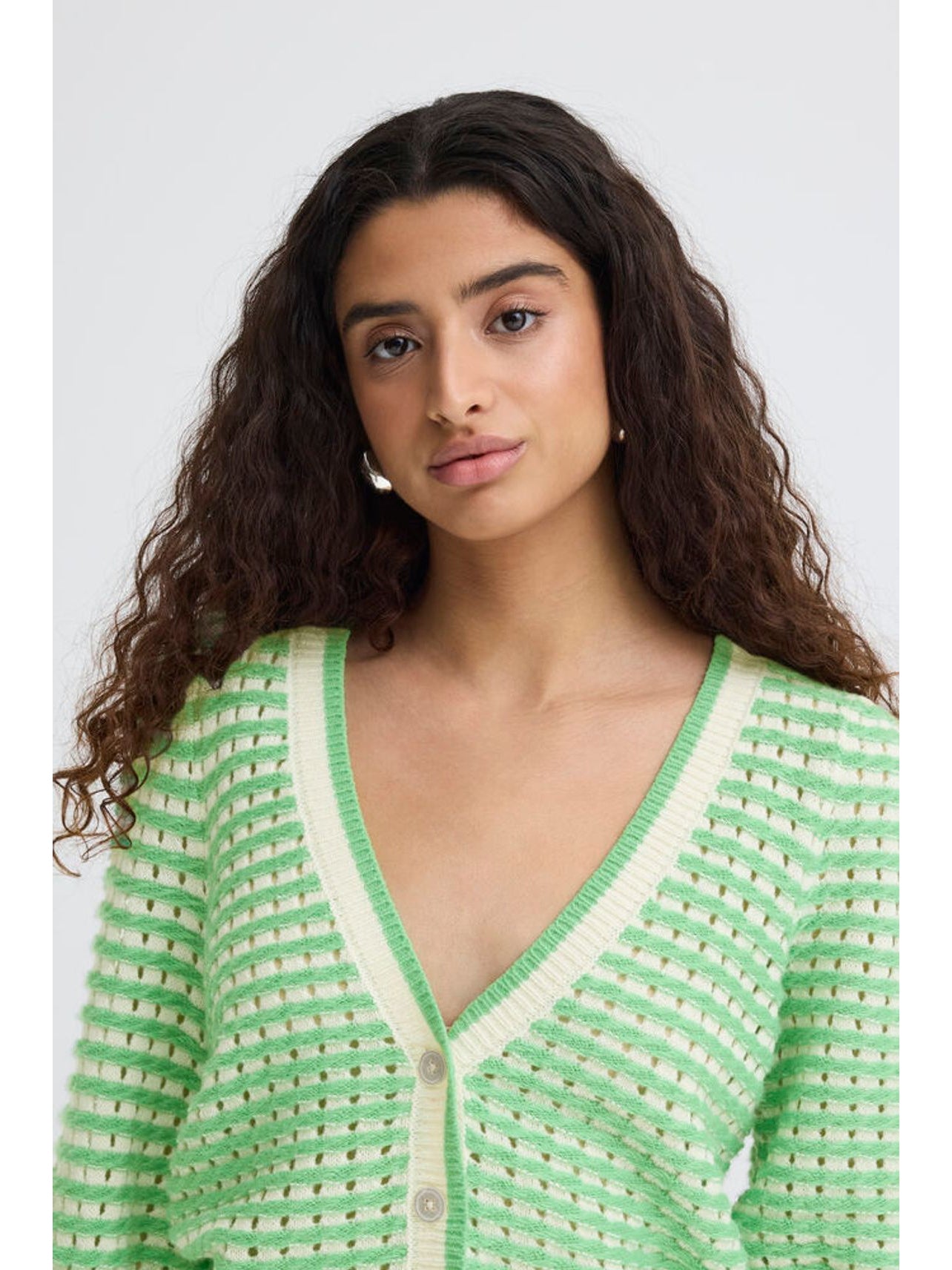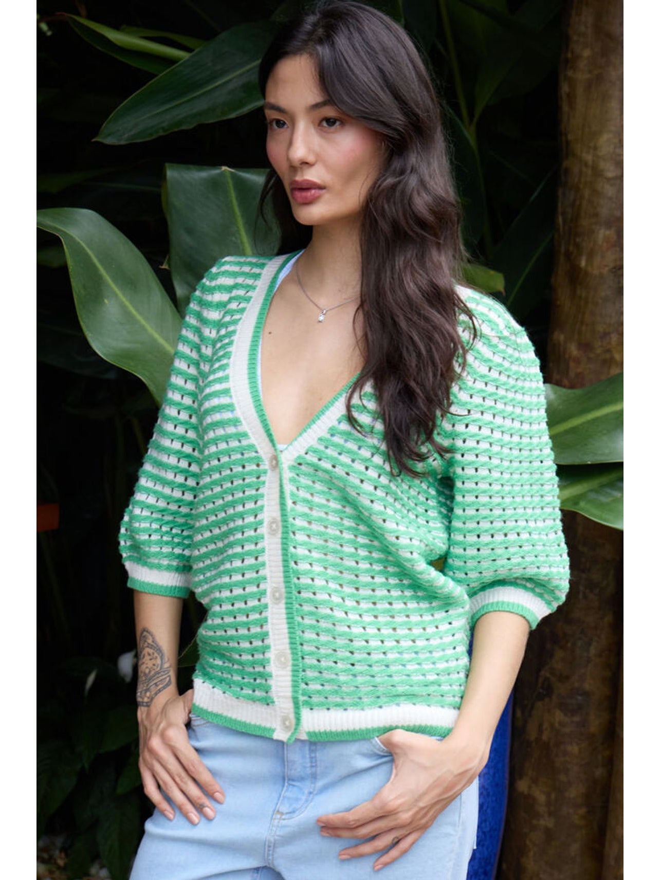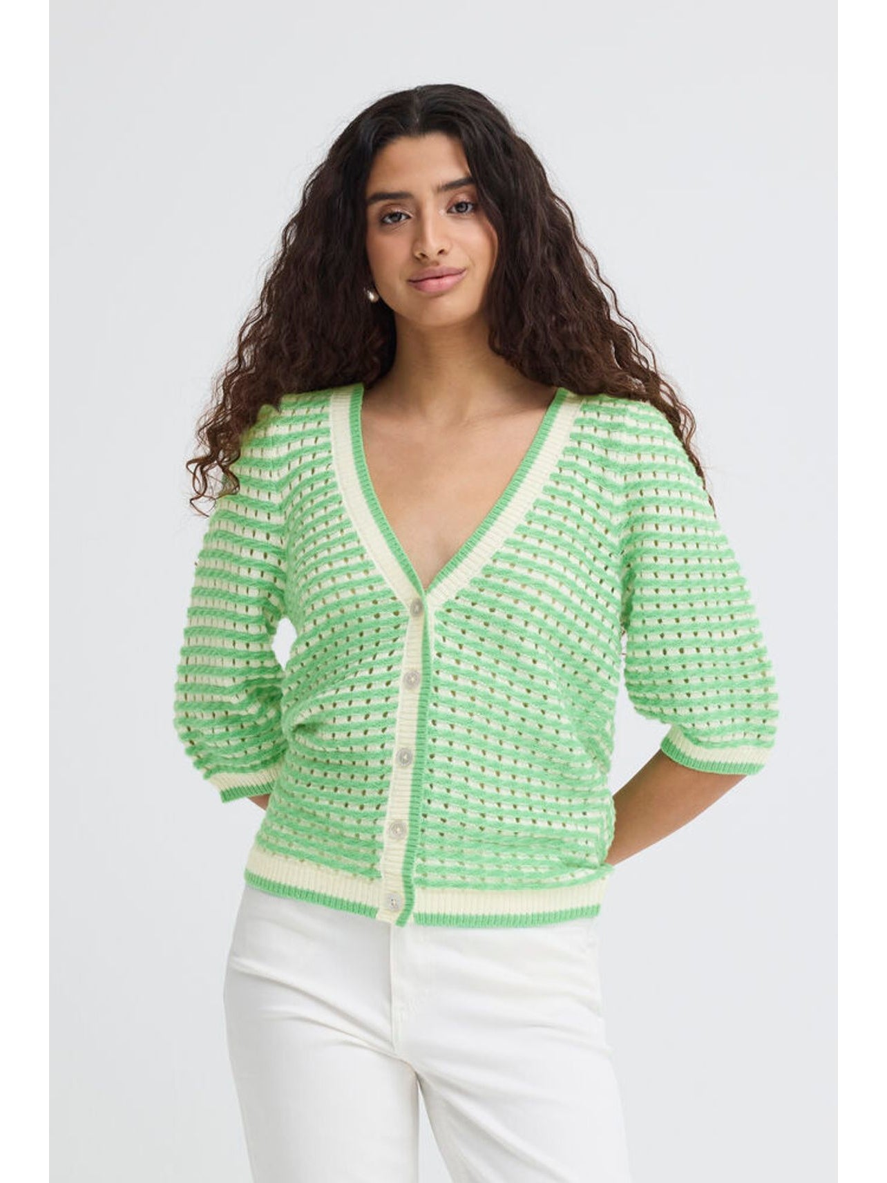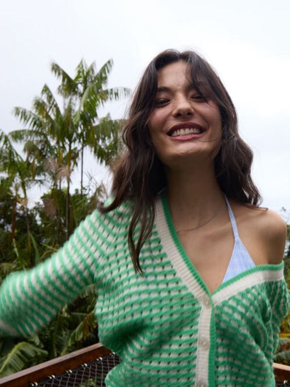 In a vibrant greenbriar stripe colour and featuring a v-neck design, this Ardina cardigan is the perfect addition to your spring wardrobe. With its shorter sleeves and button-down detail, it's both stylish and practical.