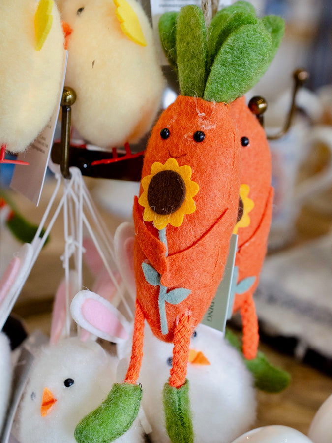 Bring a touch of springtime charm into your home with this delightful Carrot with Flower Felt Easter Hanging Decoration. Crafted in cheerful orange felt, this playful carrot features leafy green tops, dangling string legs with tiny green boots, and holds a sweet felt flower for an extra dose of character.