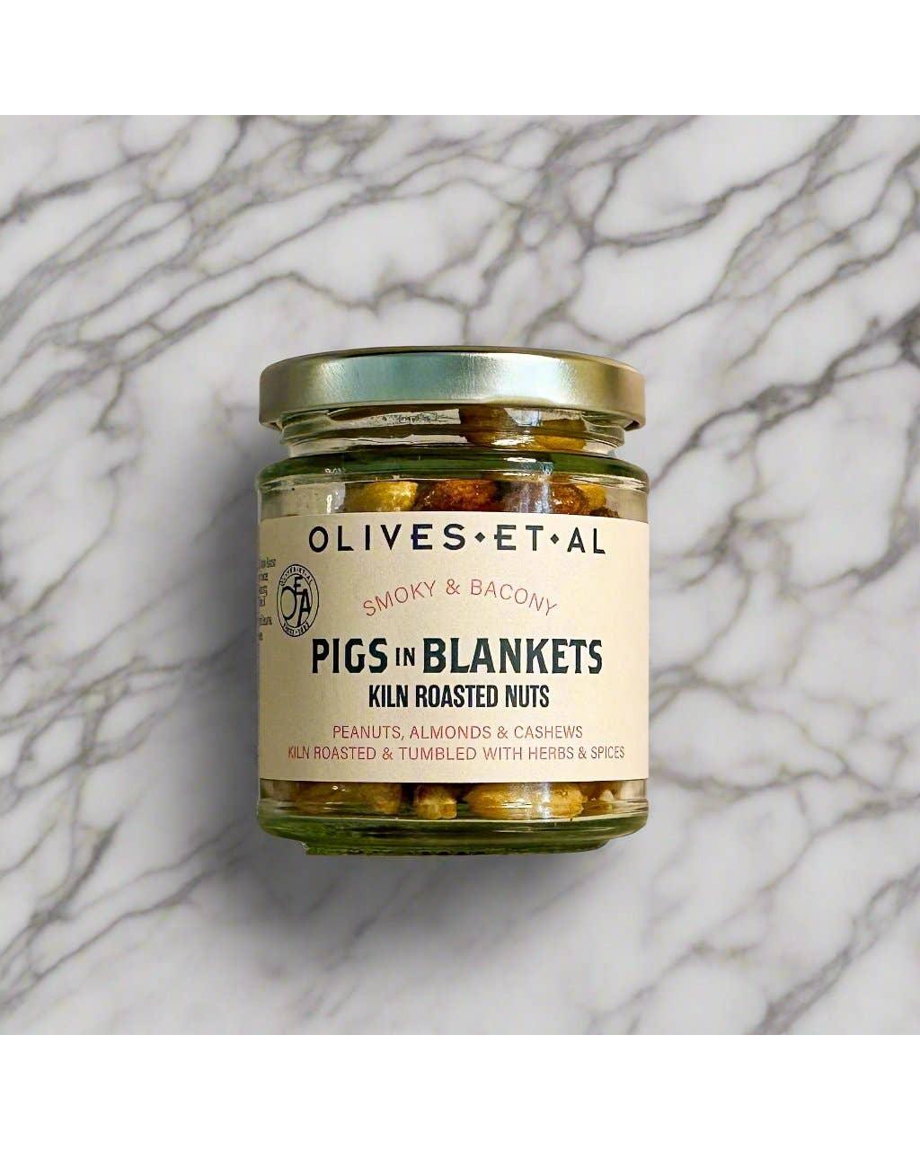 Introducing Pigs In Blankets Nuts from Olives Et Al - a unique blend of Kiln Roasted Peanuts, Cashews, and Almonds coated with savory herbs and spices and a delicious bacon-like smoky flavor. Perfect for creating gift baskets, treating loved ones, or simply for yourself. Enjoy the satisfying crunch and festive taste.