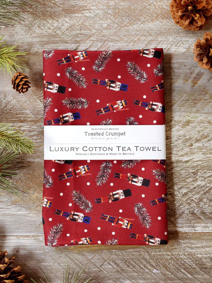 Nutcracker Tea Towel — Bring a touch of festive charm to your kitchen with this beautifully made 100% cotton tea towel. Measuring 76 x 48cm, it has a lovely thick texture and premium quality feel. Proudly designed, printed, and made in Britain, each towel comes smartly packaged with a belly band and can be easily machine washed at 30°C.