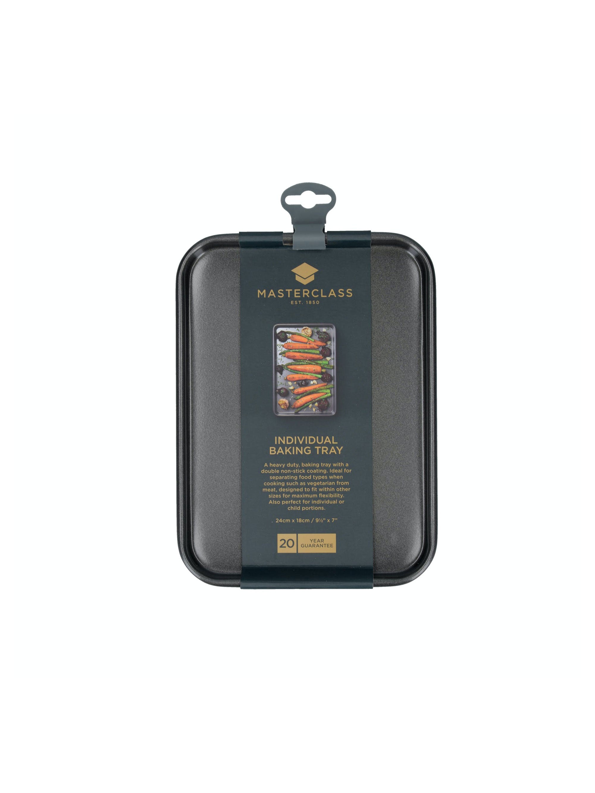 Here is the MasterClass Non-Stick Baking Tray 24cm x 18cm from Kitchen Craft. A real versatile tray that can be used for general baking, roasting and grilling of individual or child portions and for separating food types whilst cooking, great for separating vegetarian dishes from meat. It is also designed to fit in other sizes (39 cm baking tray) for maximum flexibility. Manufactured from heavy duty, commercial weight 1mm steel, with a double non-stick coating, this baking tray forms part of the MasterClass award winning bakeware collection that guarantees many years of satisfying cooking and baking.