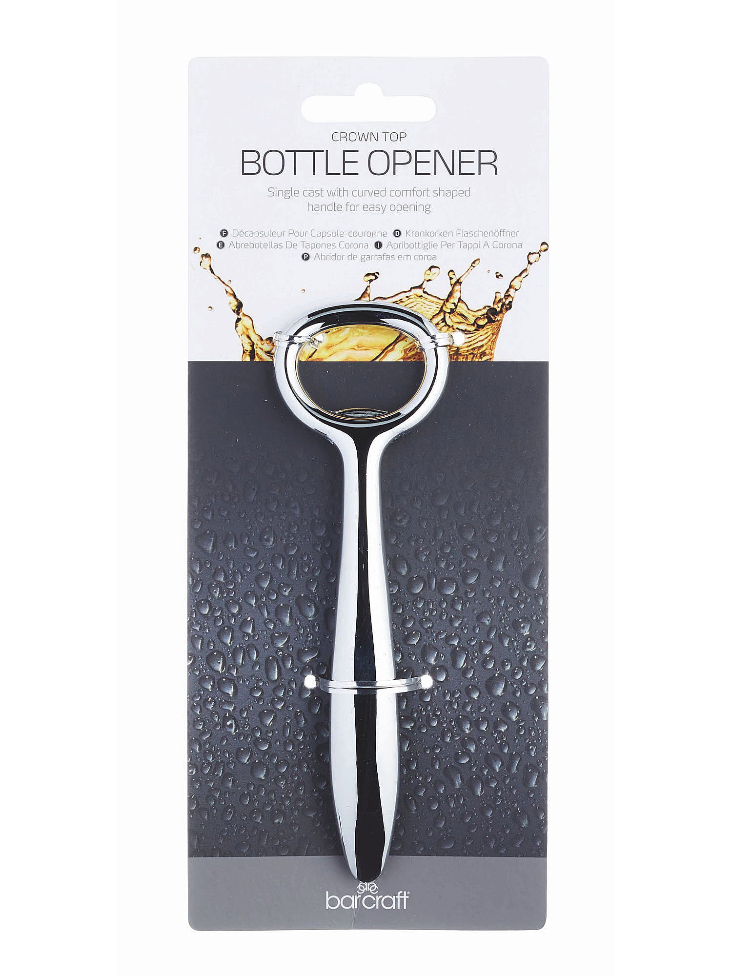 Here is the BarCraft Crown Top Bottle Opener from Kitchen Craft. A stylish crown top bottle opener with a curved comfort shaped handle and mirror polished finish, sure to stand out in your own home bar.