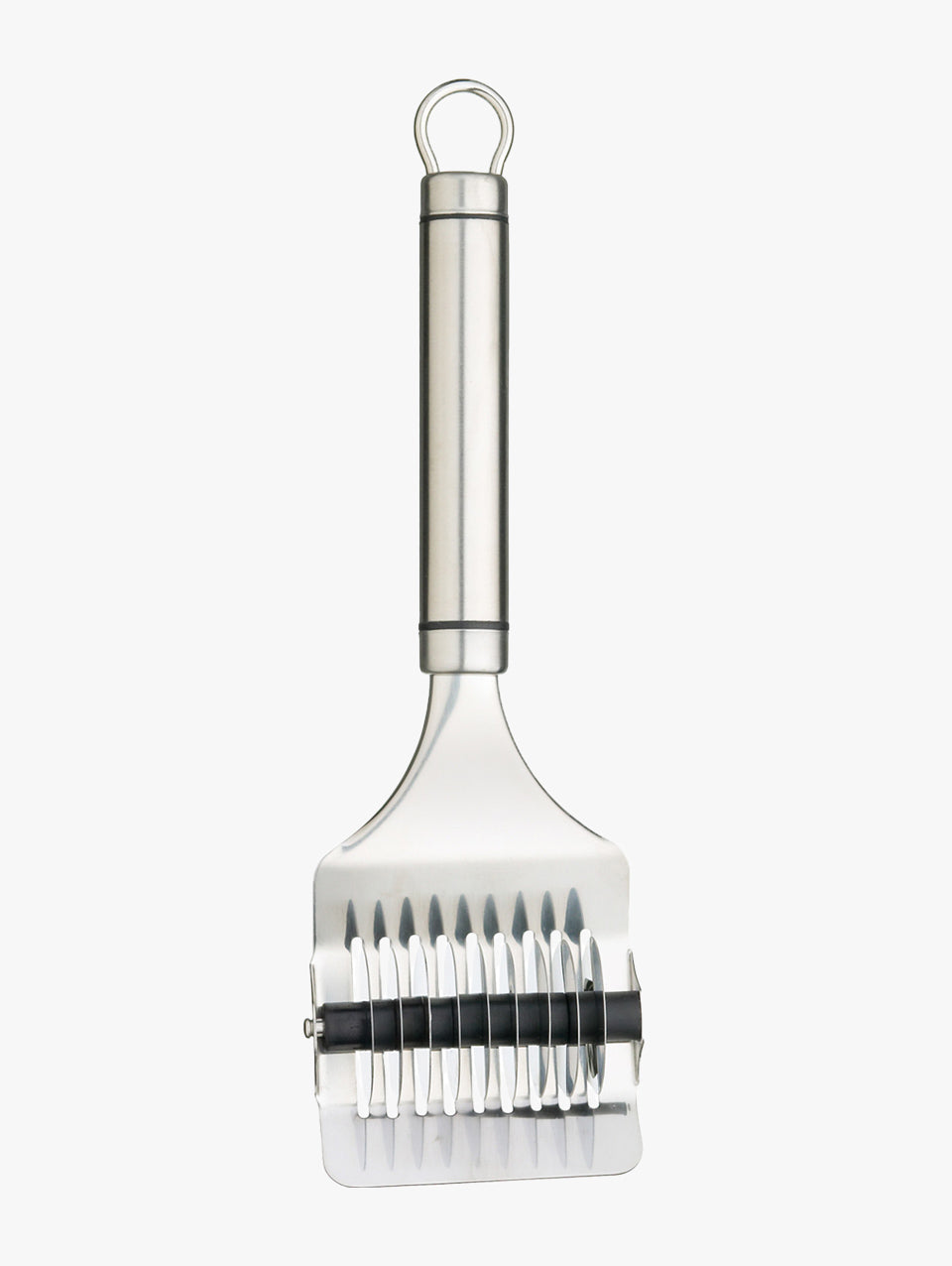 Here we have the Pro Herb Cutter from Kitchen Craft. Put down that jar of dried basil! With KitchenCraft Professional's stainless steel herb chopper, preparing fresh herbs is almost as easy as popping open a jar. This gadget simply rolls over your herbs, where nine sharp blades transform the leafy sprigs into fragrant fragments. This releases more flavour, so your favourite recipes will get even better. And you didn’t even break a sweat – perfect. Like all KitchenCraft Professional tools, this herb roller is designed to offer exceptional value and performance. It’s a sturdy, simple tool that makes chopping herbs fast and safe. And with its shiny finish, it looks great too.