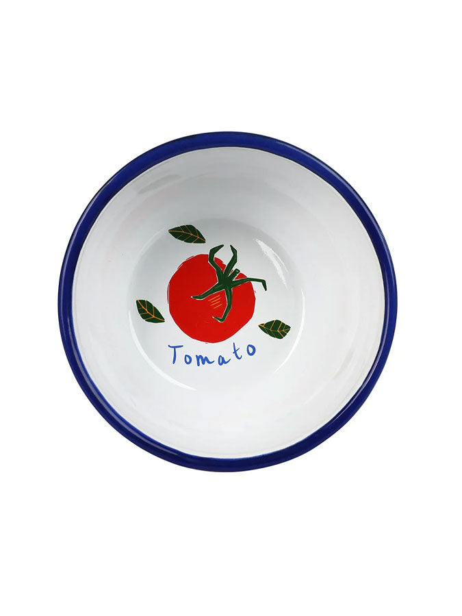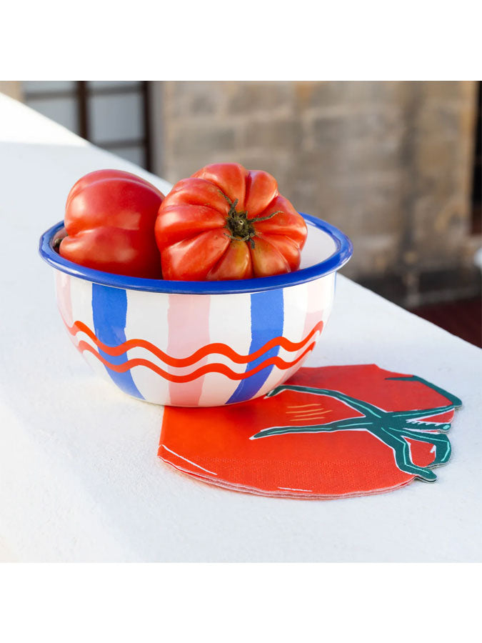 Welcome the Bon Appetit Stripe Enamel Bowl by Talking Tables into your home! This lovely bowl features a playful pink and white striped design, complemented by energetic red wiggles and a tomato pattern on the base. Each bowl is carefully crafted and hand-dipped, making it both charming and practical for any occasion!