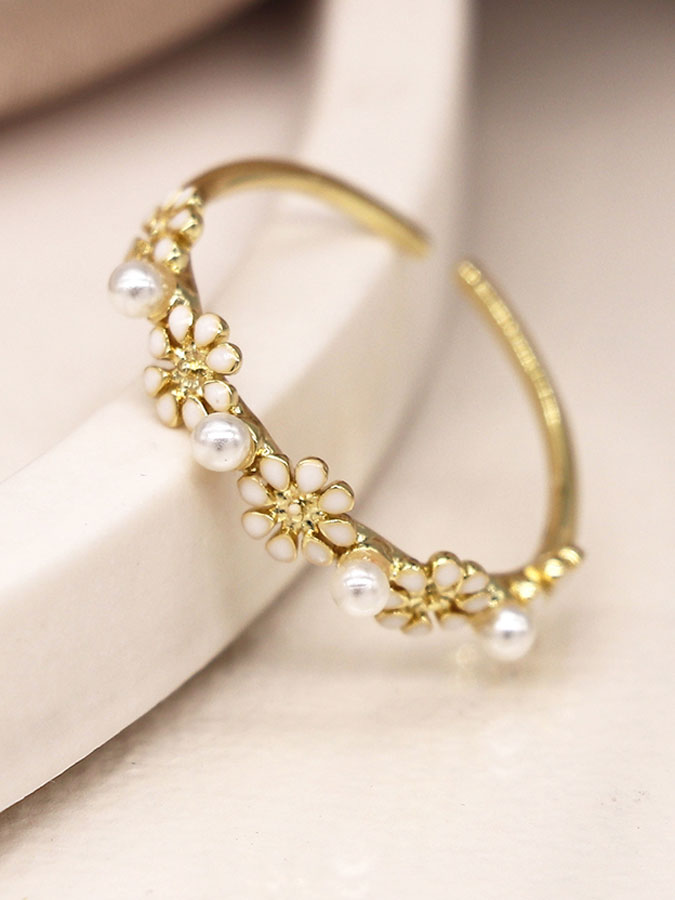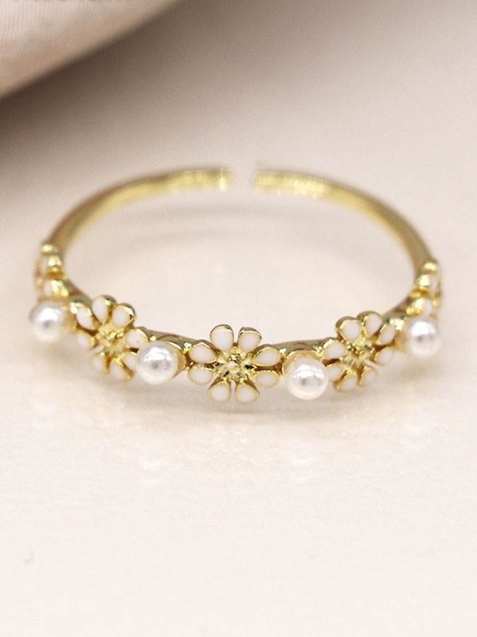 Introducing the Gold Plated Daisy And Faux Pearl Ring M/L from POM - a stunning bracelet for medium and large fingers. Featuring delicate enamel daisies and faux pearls, this ring is the ideal accessory to add to any outfit.