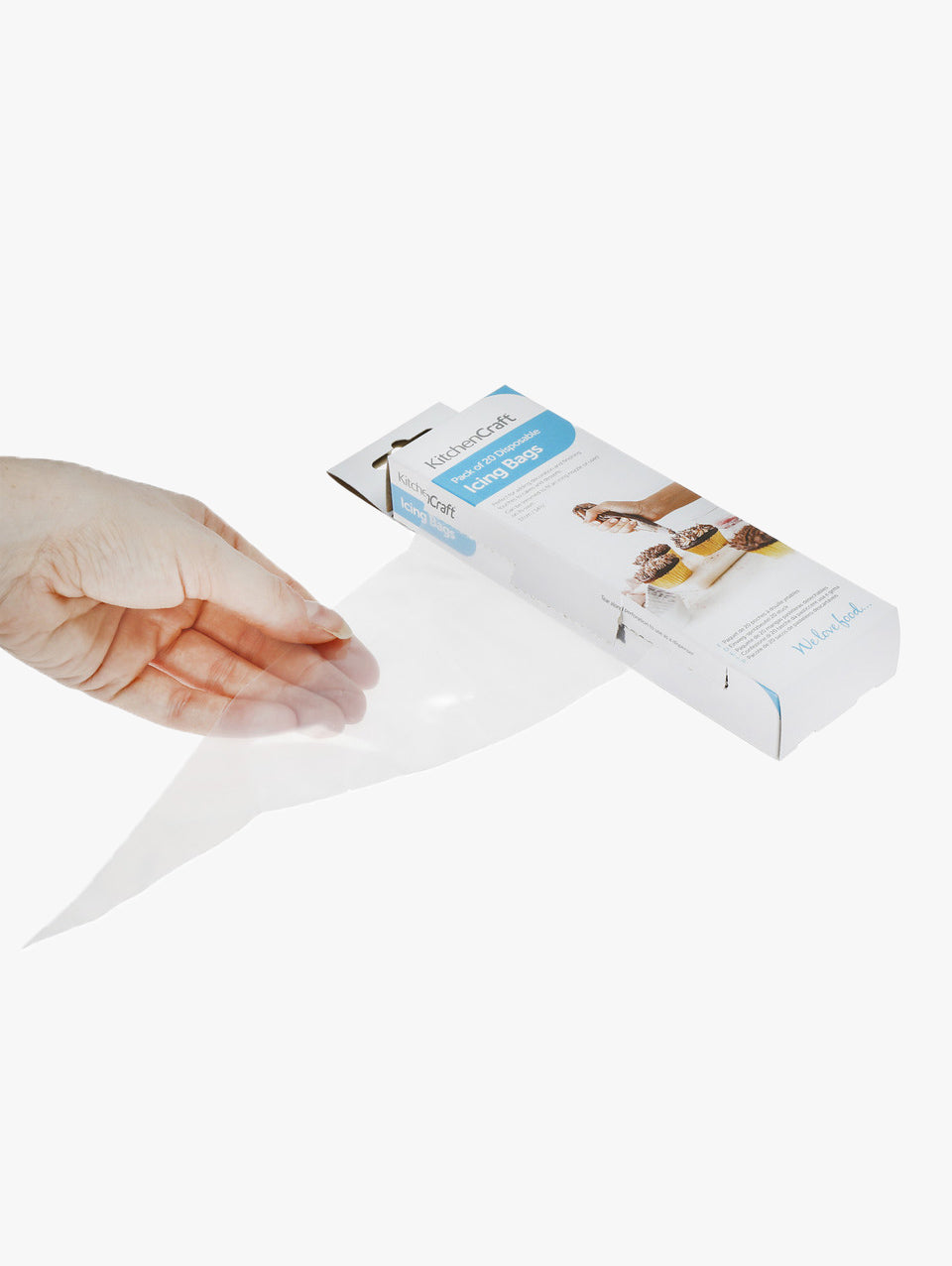 You're looking at the Disposable Icing Bags from Kitchen Craft. Icing little cupcakes, biscuits or celebration cakes for a special occasion should be loads of fun, not a chore. With these disposable icing bags, you can enjoy total convenience. Simply take one from the box and cut the end. You can either create your own tip or add a nozzle. Once you've packed in your favourite icing, a simple squeeze will see you giving your sweet treats some stand-out decorative touches. They're very versatile too. Fill them with fresh cream to pipe onto delicate, flaky pastries, chocolate ganache to decorate rich chocolatey tortes or royal icing to decorate fairy cakes and biscuits. And when you finished? No worries: simple dispose of the icing bag in your dustbin - there's no clean-up to worry about.