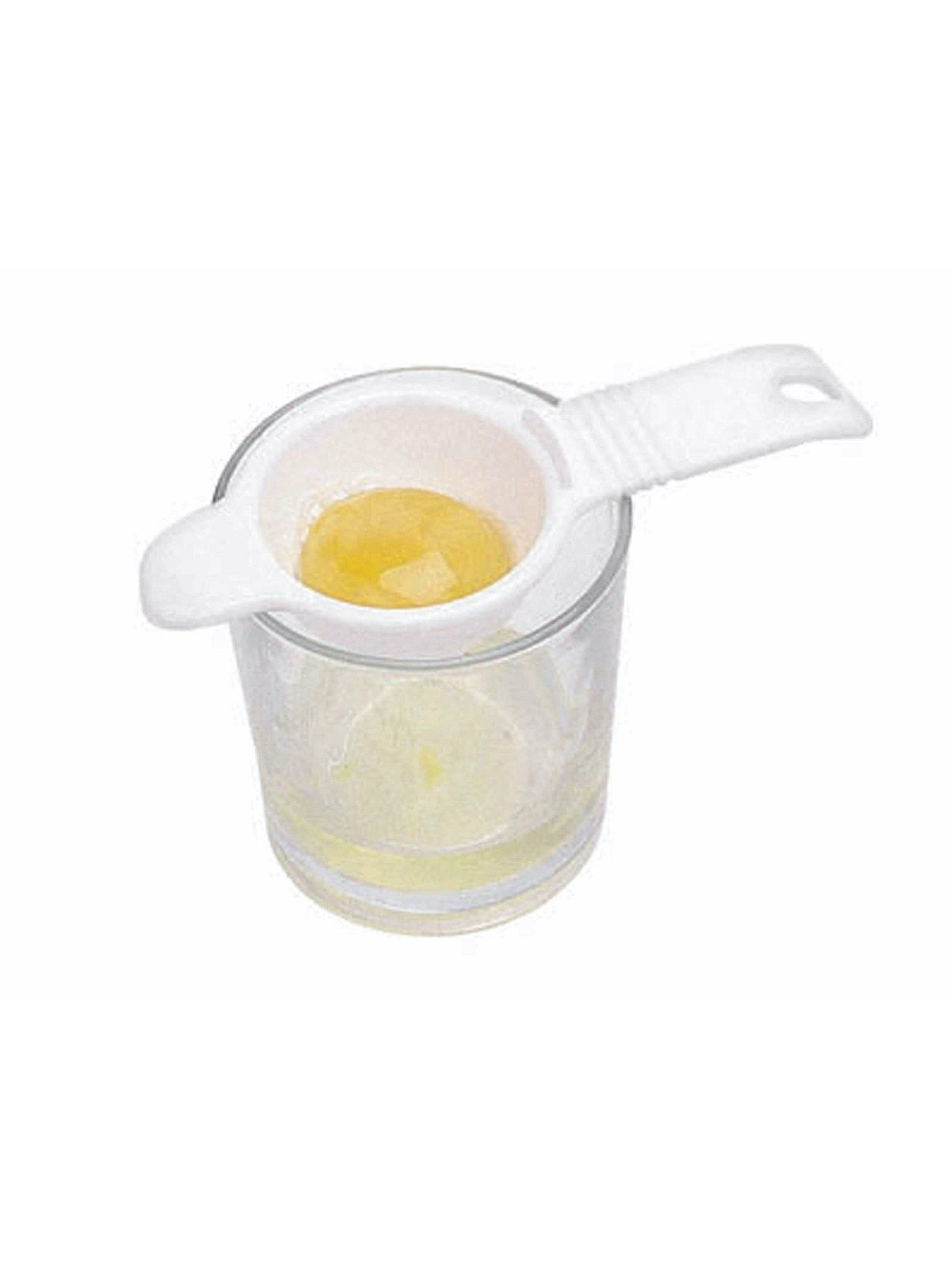 This is an Egg Separator from Kitchen Craft. Easily separate whites from yolks in seconds with this hand held heavy duty ABS plastic egg separator. Ideal for resting on any glass or container, the separator features an integral hanging storage loop to reduce kitchen clutter and an angled bowl rim rest.
