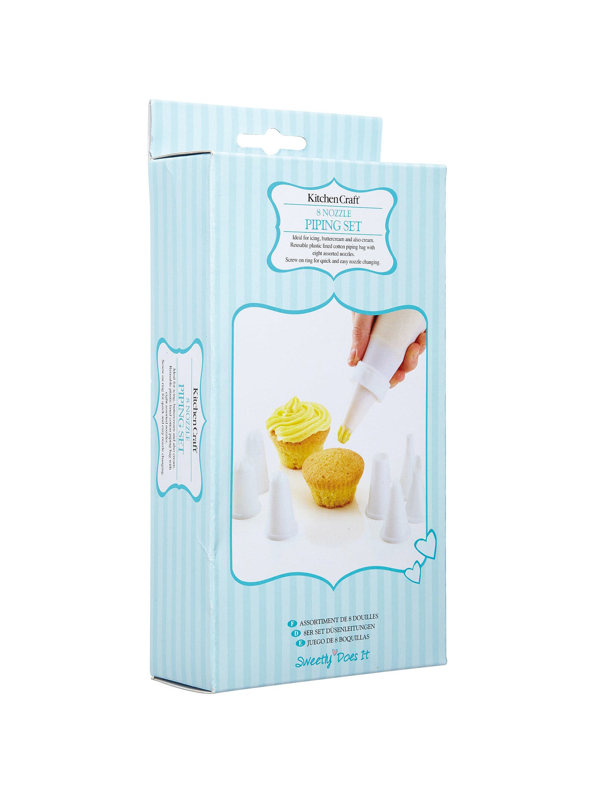Here is a Plastic Piping Set With 8 Nozzles from Kitchen Craft. Ideal for icing or piping cream and mashed potato, this versatile piping set includes a traditional plastic lined washable cotton piping bag and eight plastic nozzles. Simple to use, just screw on the selected nozzle and fill the bag. Creates rosettes, garlands, flowers, swirls, and other decorations. Perfect for putting the finishing touch to your beautifully baked cake!