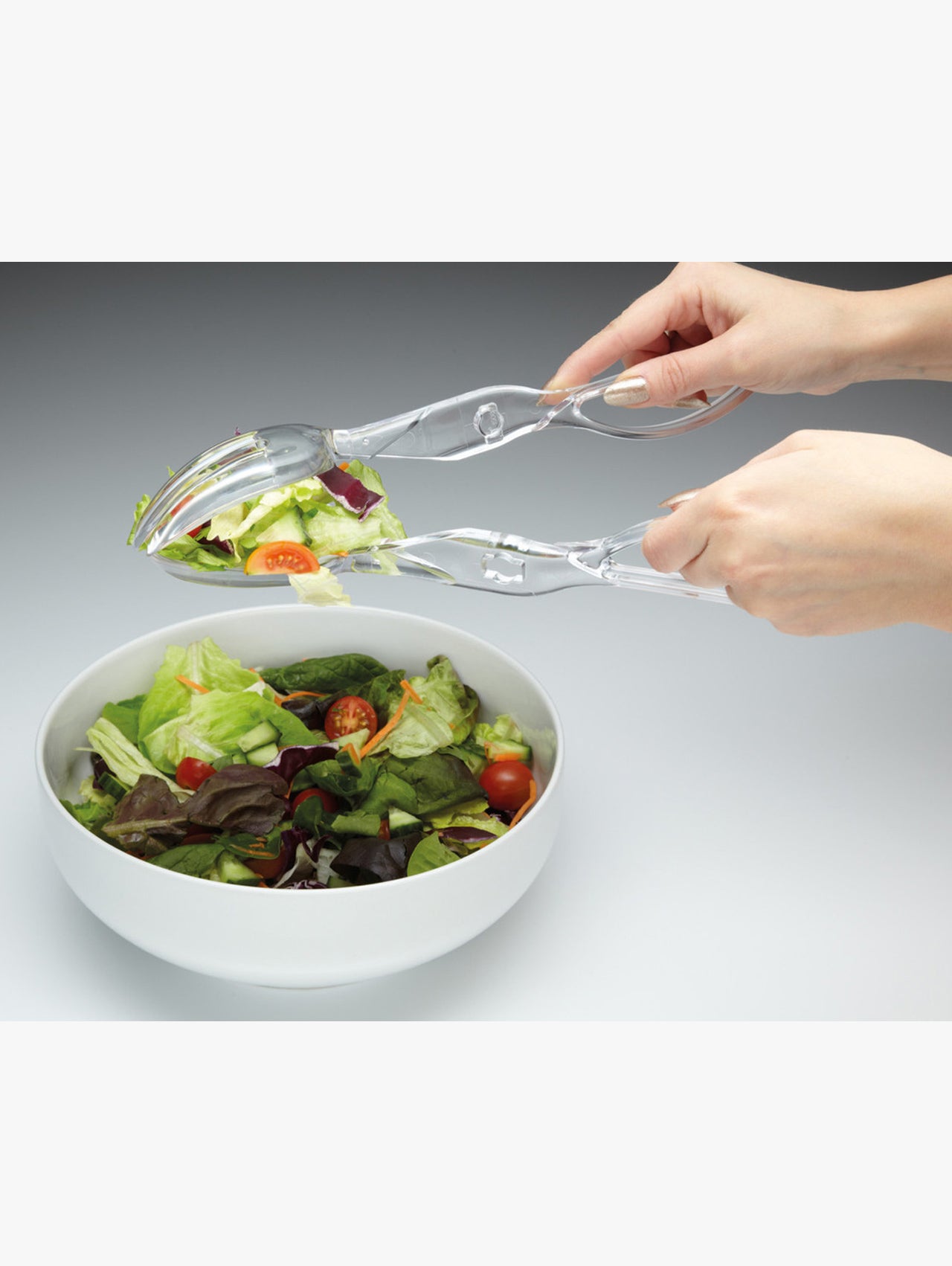 You're looking at the Salad Serving Tongs from Kitchen Craft. Tossing and serving fresh salads has never been so simple! These clever acrylic salad servers work like scissors, so you can pick up and toss salad with one hand. Leave them in the salad bowl at the buffet, and guests can lift salad onto their plate with a simple, single-handed motion. Want to go back to two-handed serving? Easy. Just pop the two sections apart, and you can use them like traditional salad servers – perfect for serving up salad in the kitchen or at the barbecue. These salad tongs are made of clear acrylic plastic, which is really robust and cleans up beautifully. Their sturdy, scissor-action design makes them a real hassle-saver for picnics and parties, and they’re great for people who find it easier to use one hand.