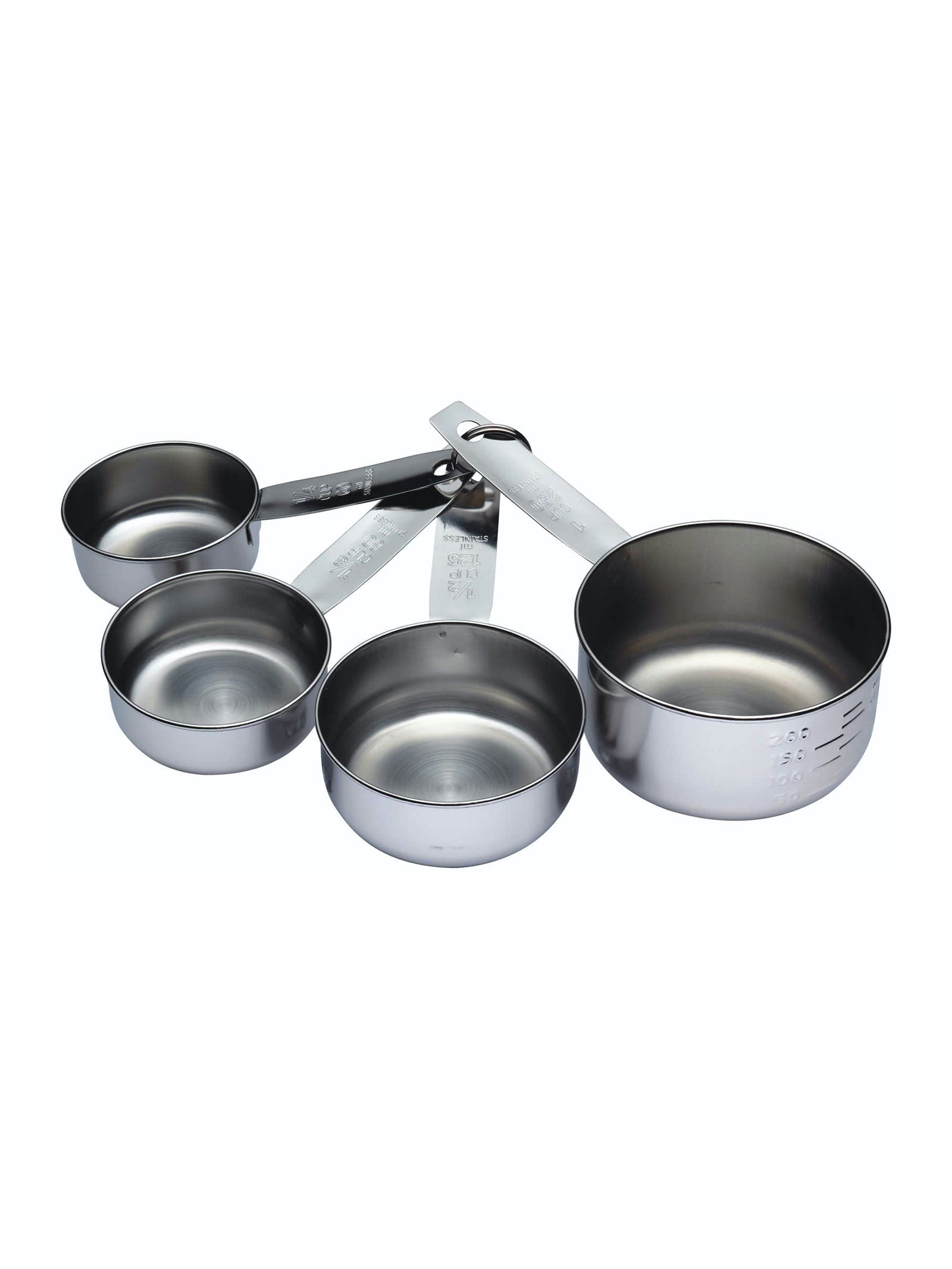 We have here the Stainless Steel 4 Piece Measuring Cup Set by Kitchen Craft. Quickly and easily ensure you have correct measurements with this set of four stylish, polished stainless steel measuring cups with clearly marked external ml and cup measuring guides, and wide, easy to grip handles. Includes 1/4, 1/2, 3/4 and one cup measures, and a storage ring to keep all cups together and ready at hand.