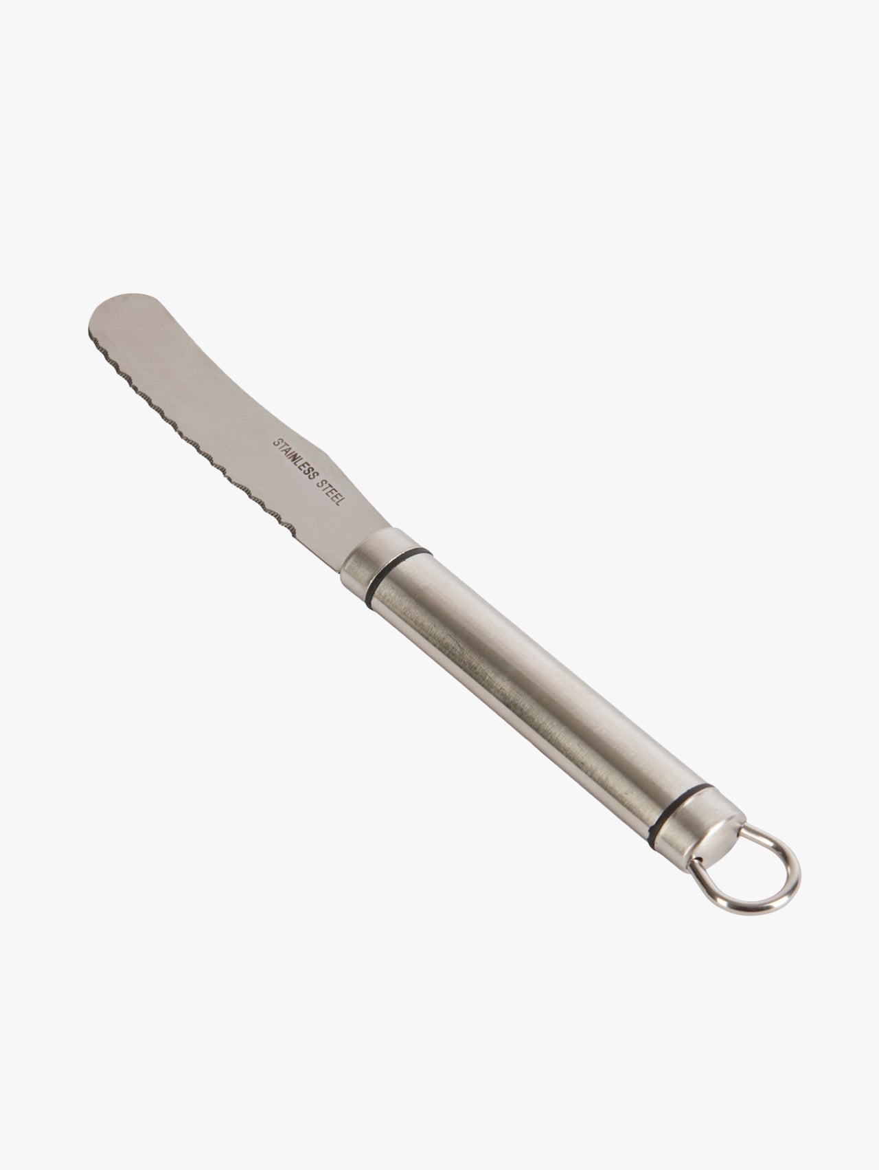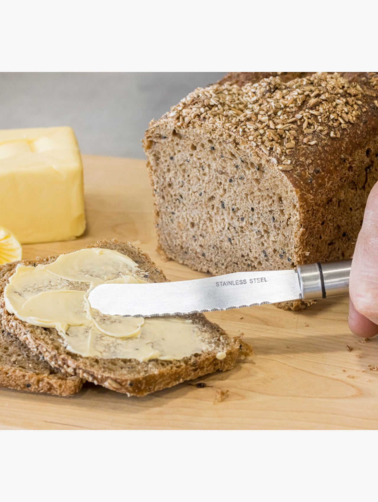 This is the Stainless Steel Pro Butter Spreader from Kitchen Craft. Butter, strawberry jam, cheese spread – whatever your sandwich filling of choice, KitchenCraft Professional's butter spreader makes smothering bread smooth and simple. Just add your favourite sandwich spread! The key improvement on traditional butter knives is its serrated edge. This makes it easy to scrape chilled butter for easy spreading, and you can even use it to cut sandwiches or toast in half, or slice soft ingredients. As for the rest of it, it’s a nice, flat butter knife that spreads beautifully and is comfortable to hold. And because it’s made of stainless steel, it’s strong, easy to clean, and looks great on the dining table!