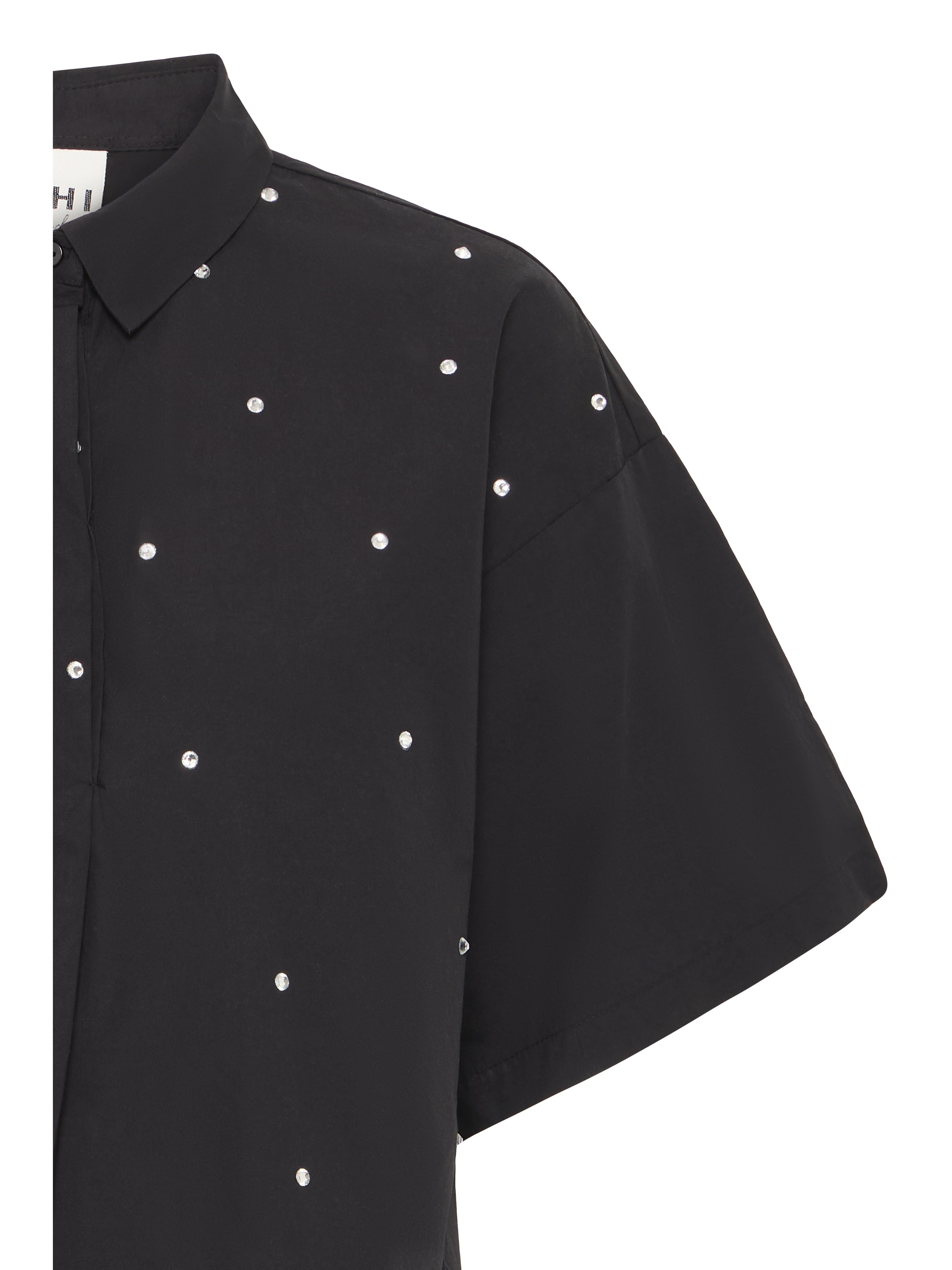 Meet the Lisari Shirt — a chic black short-sleeve style with a touch of sparkle. Designed with a subtle diamante pattern, it pairs a classic collared neckline with a relaxed, boxy fit for effortless wear. Finished with a neat two-button placket, it’s the perfect piece to dress up denim or add a little shine to your everyday looks.