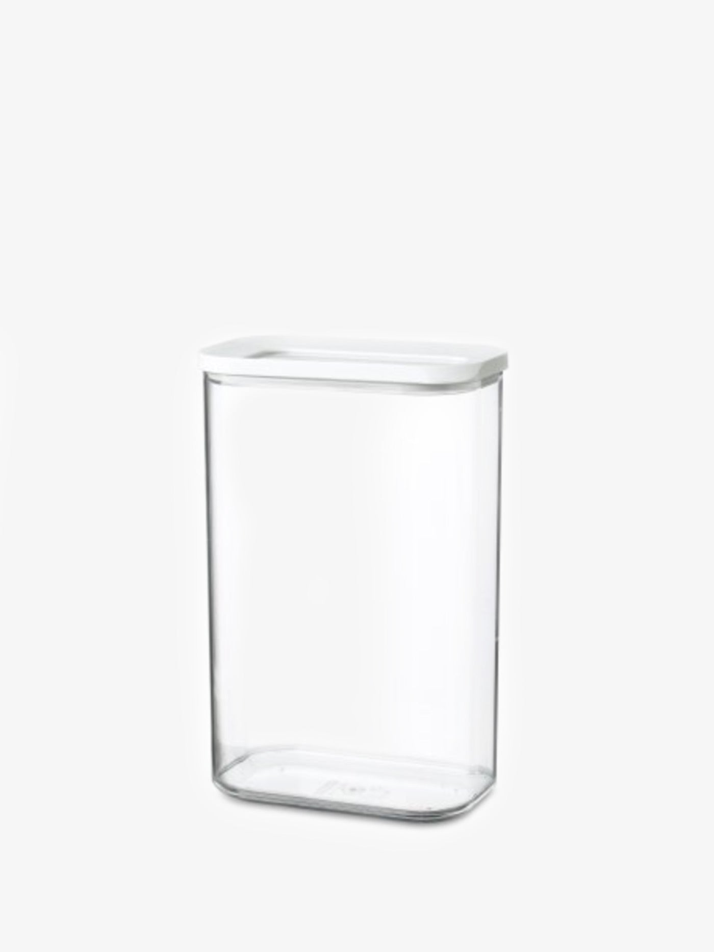 This is the Storage Box Modula 2000ml – White from Mepal. This rectangular (2000 ml / 68 oz ) storage box has lovely rounded corners and its transparent lid allows you to see its contents instantly, even in your kitchen drawer. The white ring provides a perfect fitting which makes this box ideal for storing dried food such as pasta, flour, biscuits or packets of soup. The Modula storage boxes are available in a variety of sizes and shapes, are easy to open, stackable and dishwasher safe. Outstanding practical features combined with a stylish design, the Modula has it all!