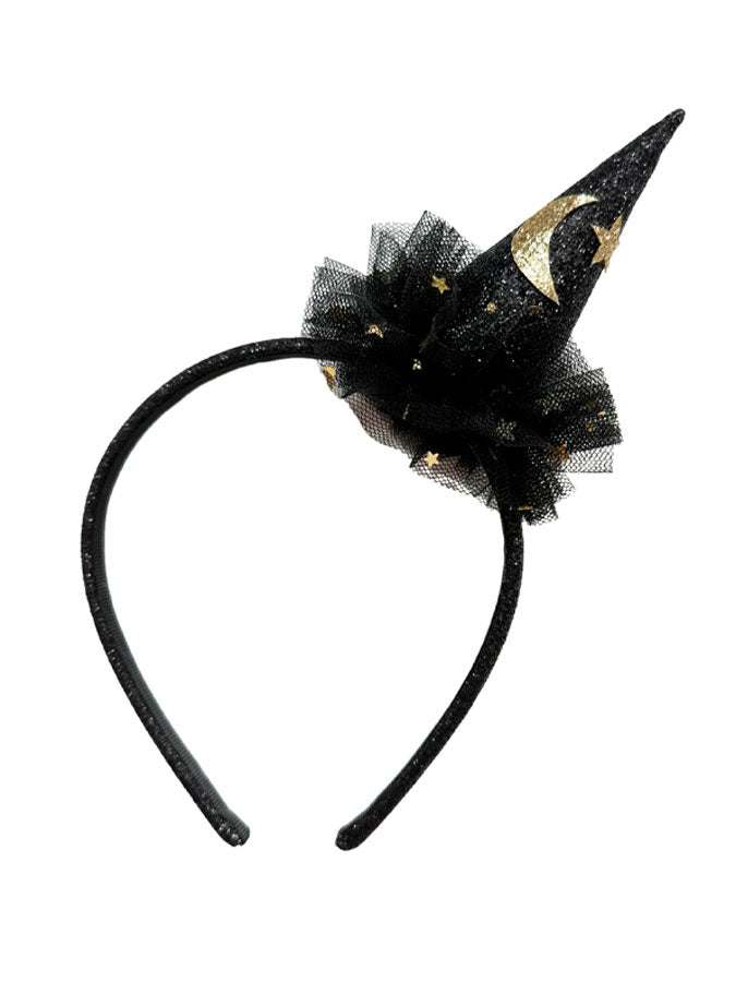 Get ready for the spookiest night of the year with Rockahula's Sparkle Witches Hat Headband. This mini witches hat, made from black fabric, is adorned with a gold glitter moon and star and a gold star-studded tulle ruffle. It sits perfectly on a sparkling black glitter band to complete the look. A must have accessory for trick or treating!
