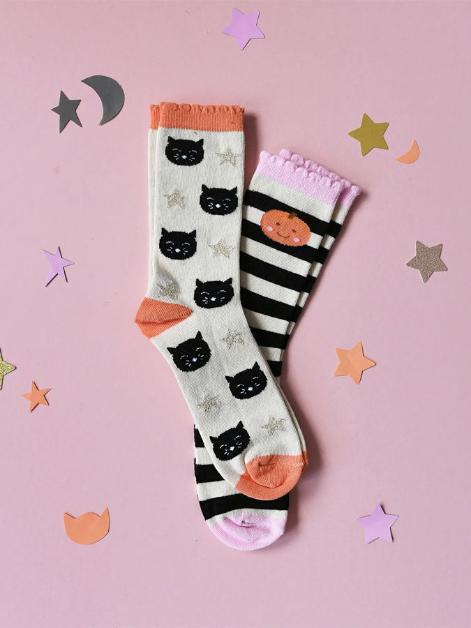 Introducing the Spooky Halloween Socks from Rockahula. This pack includes two pairs of socks - one with a striped pattern featuring a pumpkin, and the other with cute cats. Made with organic cotton, these socks are not only stylish, but also eco-friendly. They're perfect for the Halloween season.