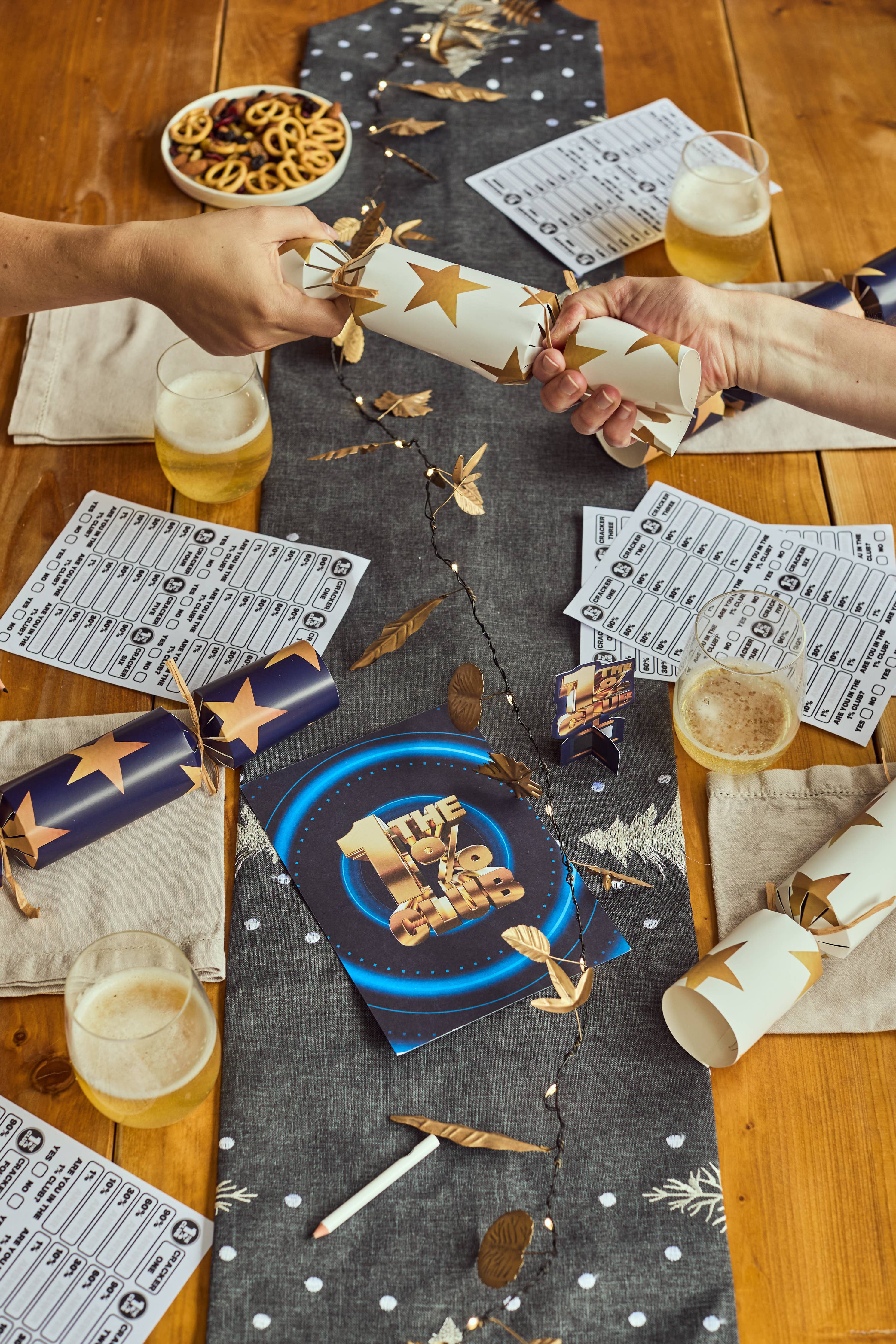 Each cracker contains a hat, 1% Club pencil and 5 questions, starting with one 90% of people can answer and getting harder until you reach the 1% question. Find out who among you has what it takes to join the 1% club.